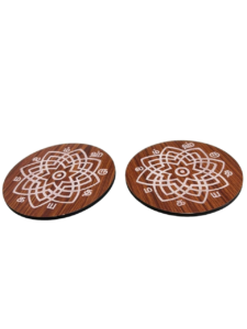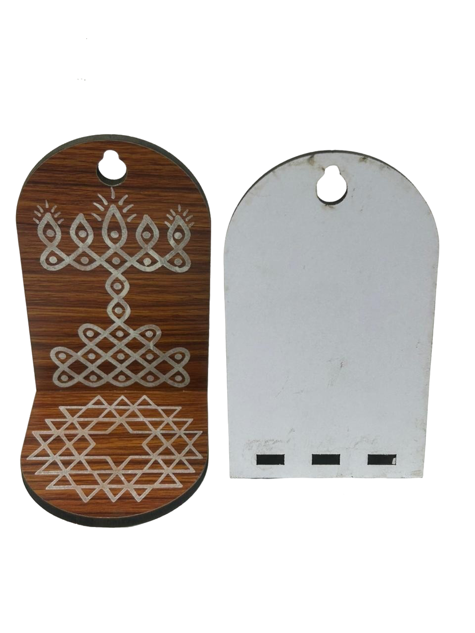 Elegant MDF Wall Hanging featuring Aishwarya Kolam & Vilakku engraving, symbolizing prosperity and positivity. Crafted from premium MDF wood with a compact size of 12cm height and 7cm width, perfect for pooja rooms, entrances, or home décor. Durable, lightweight, and Made in India, this set of 2 pieces is ideal for traditional decoration and thoughtful gifting.