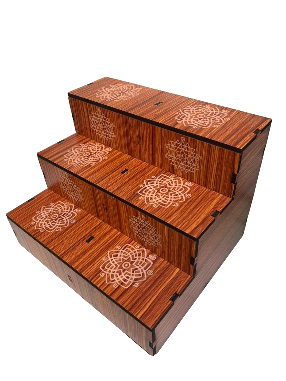 Compact Miniature 3 Steps MDF Golu Stand (Closed Type) crafted from durable MDF wood, ideal for displaying small dolls and idols during Navaratri Golu celebrations. Measuring 21cm (L) x 25cm (B) x 18cm (H), this sturdy and reusable stand offers a neat and elegant display for festive décor and pooja arrangements. Lightweight, strong, and proudly Made in India, perfect for traditional home celebrations.